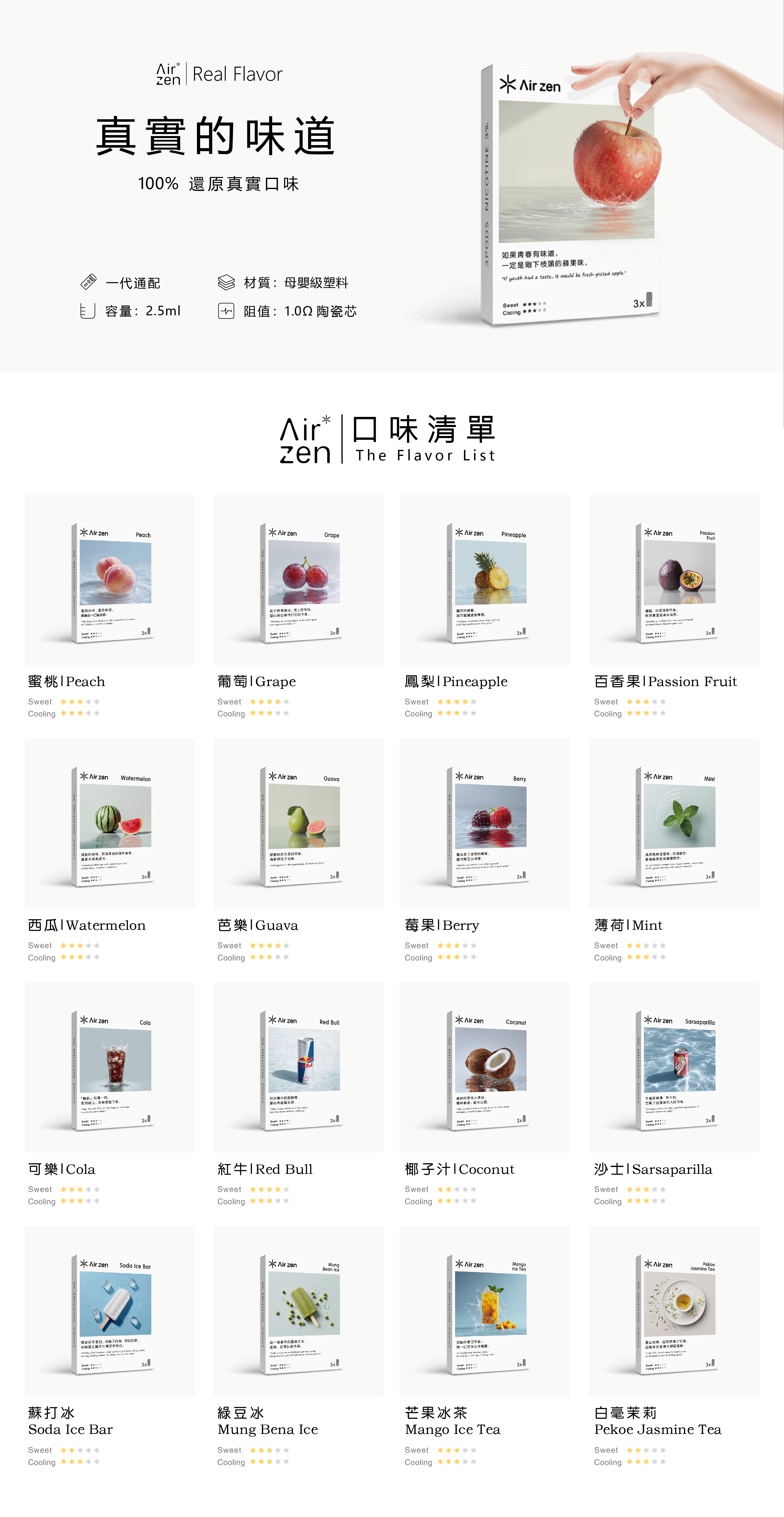 作為台灣正品,AirZen 艾爾藍煙彈嚴格把控每一批次產品品質,確保每一次吸入都順滑安全、滿足味覺享受。煙油成分包含甘油、丙二醇、香精與有機尼古丁,安全潔净,為您帶來安心的使用體驗。 - 多樣口味,盡情選擇